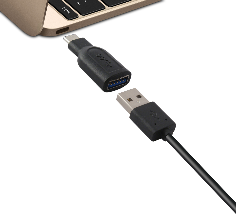 USB 3.1 Typ einfügen C-Anschluss vom Adapter zum USB 3.1 Type C-Anschluss von Ihrem neuen Generationsgerät (z.B. einem MacBook). Dann verbinden Sie Ihr Standardgerät mit dem USB-Anschluss Typ A des Adapters mit einem USB-Kabel Typ A.