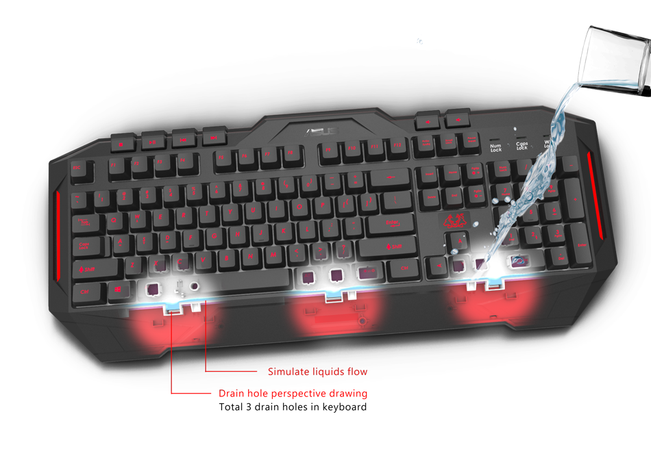 Das Gaming Cerberus Tastatur-Design beinhaltet ein spritzwasserdichtes Design, um Flüssigkeitsspritzen Probleme zu vermeiden. Die drei Entwässerungslöcher verhindern, dass die Flüssigkeiten zwischen den Schlüsseln stagnieren und erleichtern eine einfachere Reinigung, um so schnell wie möglich zu Ihren Spielen zurückzukehren.