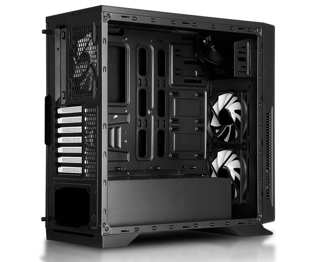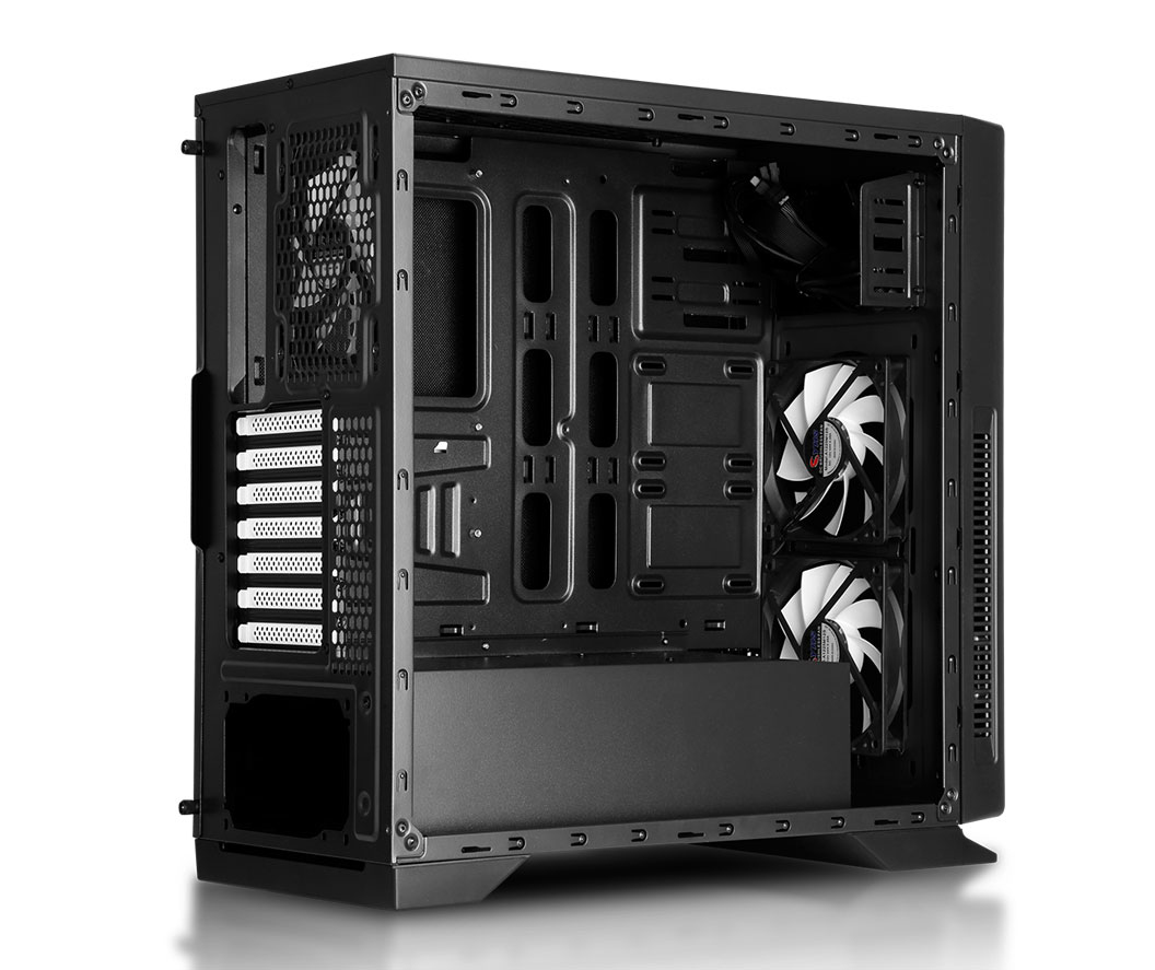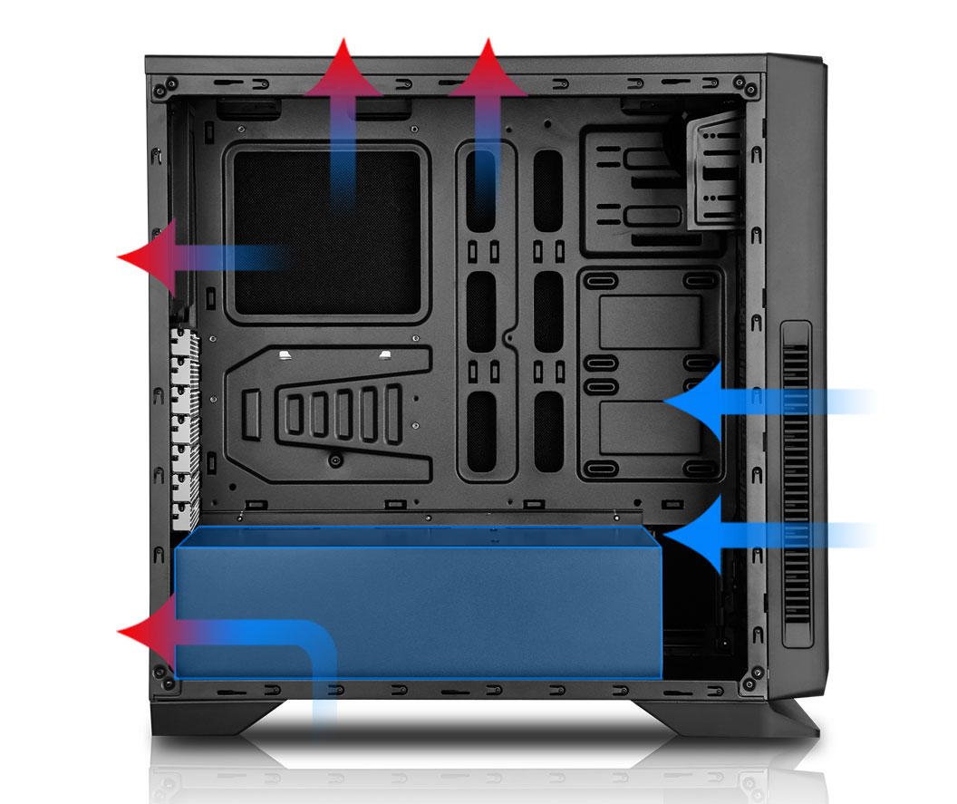 Dank des Frontgitters und der Ventilatoren wird der Kaltluftdurchsatz direkt innen einlaufen, um die Grafik und andere Komponenten zu kühlen. Die Anordnung der PSU und des hinteren Lüfters wird dazu beitragen, die gesamte Wärme nach außen zu treiben und einen effektiven Luftstrom zu ermöglichen.