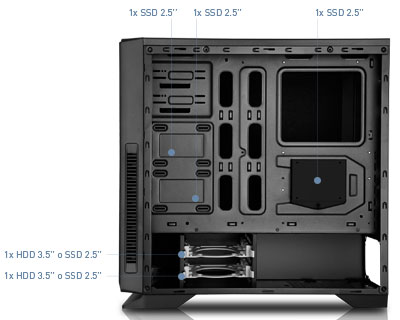 Hummer ZN hat Platz, um bis zu 7 Speichereinheiten zu installieren, da es zwei externe Buchten von 5,25 "und Kapazität für fünf weitere Einheiten innen, zwei von 3,5" auf der Unterseite und drei SSD von 2,5 "auf den Seiten.