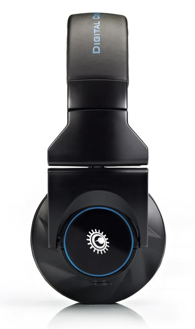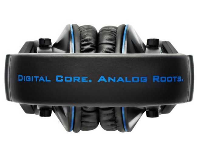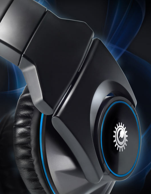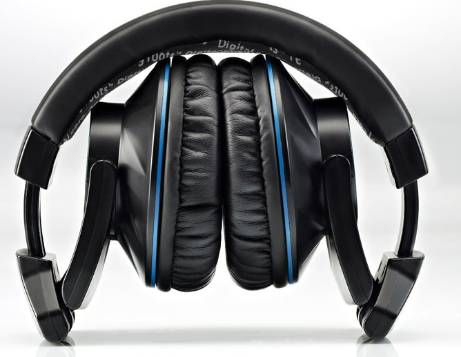 Schwarzes Gewebe, mattes Gehäuse mit blauen Linien, helle Decke von Kopfhörern