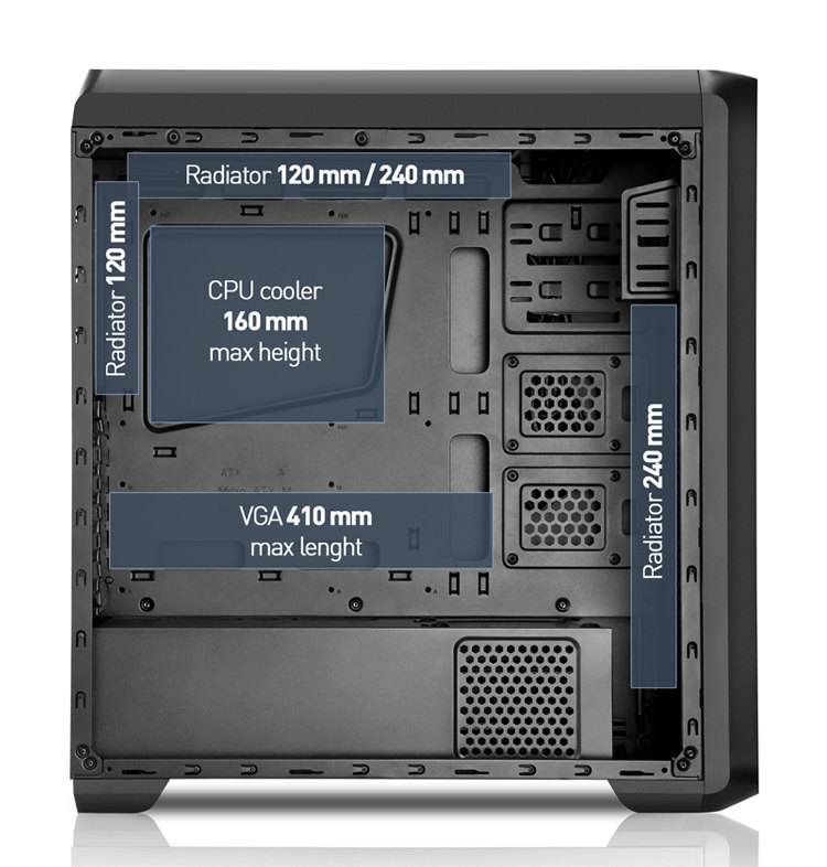 - Vorbereitet für Flüssigkeitskühlung mit Platz zur Montage von Heizkörpern bis 240 mm