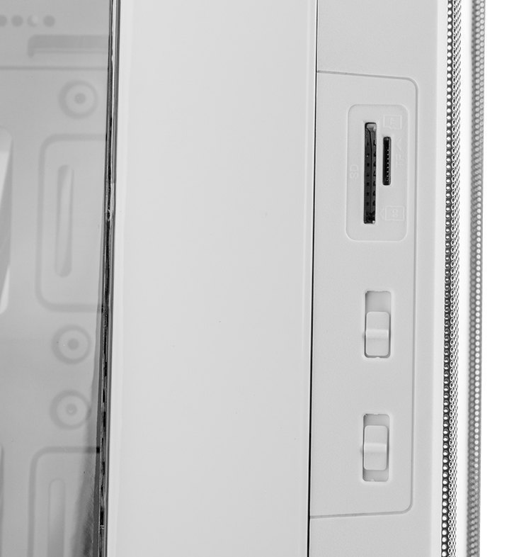 Der Hummer ZS Zero Front Panel hat zwei USB 2.0 Ports und zwei USB 3.0 Ports sowie Audio-Verbindungen. Auf der Seitentafel finden wir zum einen zwei Geschwindigkeitsregler zur Steuerung von bis zu 4 Lüftern, einstellbar in 3 Positionen: LOW / STOP / HIGH und zum anderen SD- und Micro SD-Kartenleser, die die Zugänglichkeit zu den Anschlüssen aller externen Geräte erleichtern.