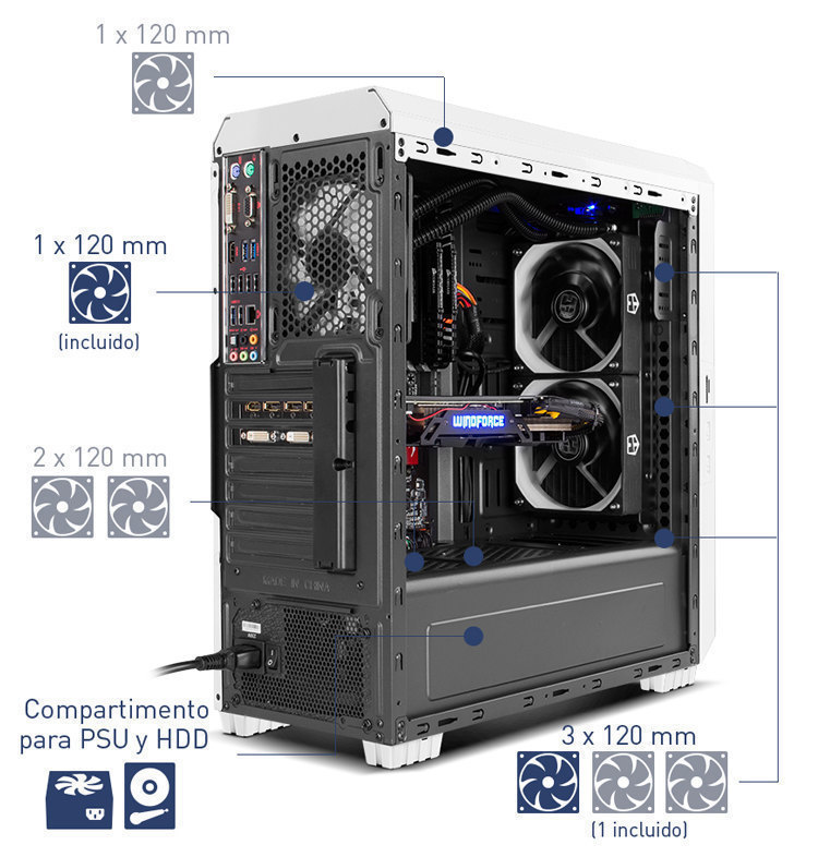 Es hat ein Fach an der Unterseite, um die PSU und die HDD zu lokalisieren, so dass die von ihnen freigesetzte Wärme nicht auf die anderen Komponenten übertragen wird. Darüber hinaus hat dieses Fach die Möglichkeit, zwei 120 mm Lüfter an der Oberseite zu installieren, um die von der PSU und der HDD erzeugte Wärme zu extrahieren.