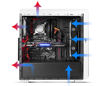 Hummer ZS Zero verfügt über ein ausgezeichnetes Lüftungssystem, das einen effektiven Luftstrom innerhalb der Anlage gewährleistet. Es hat zwei 120 mm Lüfter, eine auf der Vorderseite und eine auf der Rückseite. Darüber hinaus bietet es die Möglichkeit, drei Ventilatoren mehr als 120 mm zu installieren; zwei auf der Vorderseite und eine auf der Oberseite.