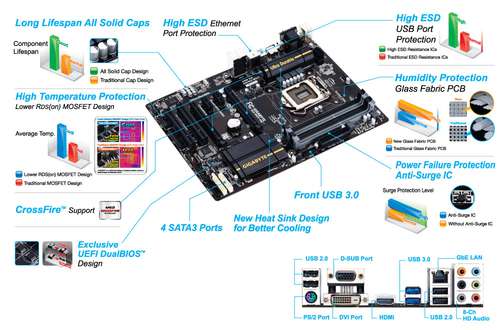 Gigabyte GA-B85-HD3. kompatible Speichertypen: DDR3-SDRAM, Art der Speicherplätze: DIMM, Speicherkanalunterstützung: Dual. Prozessorfamilie: Intel, kompatibler Prozessor: Celeron, Core i3, Core i5, Core i7, Pentium, Prozessorbuchse: Socket H3 (LGA 1150). Unterstützt Festplattenschnittstellen: SATA, serielle ATA II, serielle ATA III. HDMI-Version: 1.4. Komponente für: PC, Familie der Stammkartenkomponenten: Intel, Integrierte Stammkartenschaltung: Intel B85