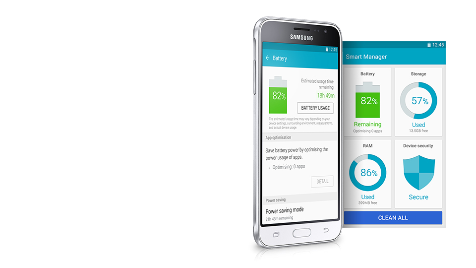 Mit der Smart Manager-Anwendung können Sie wesentliche Informationen von Ihrem Galaxy J3 überprüfen und steuern, wie Batterie-Level, verfügbare Speicherkapazität, RAM-Leistung, Dateien löschen und das Antivirus, alles auf einfachste Weise passieren.