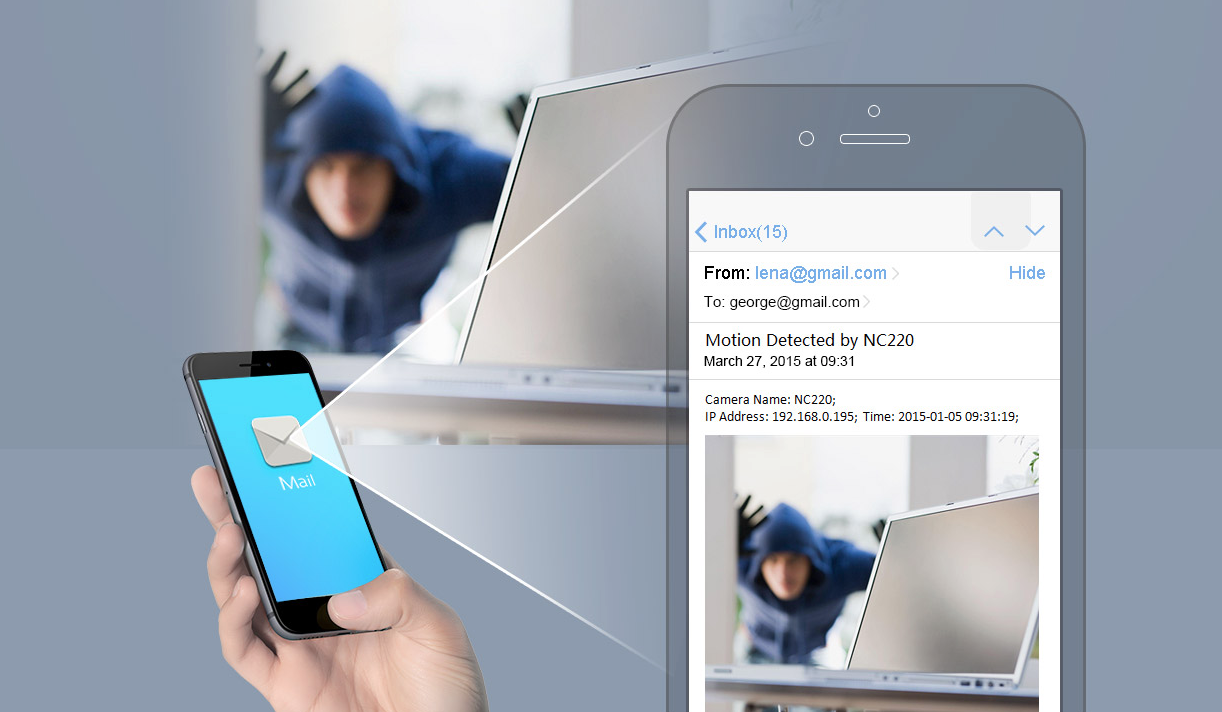 Die NC220 kann konfiguriert werden, um sofortige Benachrichtigungen per E-Mail oder FTP automatisch zu senden, wenn Bewegung oder Ton erkannt wird, so dass Sie sich bewusst bleiben, was im Aufenthalt passiert.